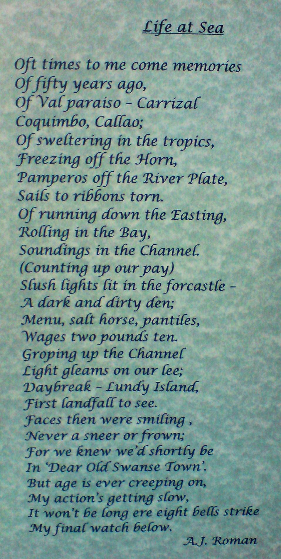 Wonderful old poem..Probably written in the sailing ship times maybe? My brother Ray Heddon was once in the Merchant Navy [now he deceiced] Anyone know any names of old seamen I wonder?
