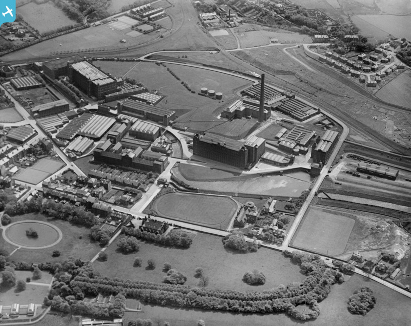 Many industrial town images from the air feature textile mills. Some are quite impressive and are seen at work, often in the 1920s. The Argyll Mill shown in the group header was where my grand father was mill engineer until the early 1960s in charge of the mill's mighty steam engines (built by George Saxon of Openshaw).