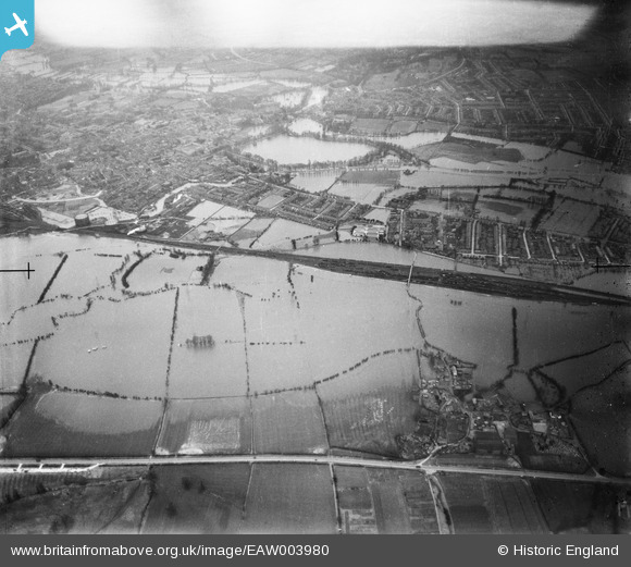 | Pennawd | [EAW003980] Flooding around the railway line between South and New Hinksey, South Hinksey, from the south-west, 1947. This image has been produced from a damaged negative. |
