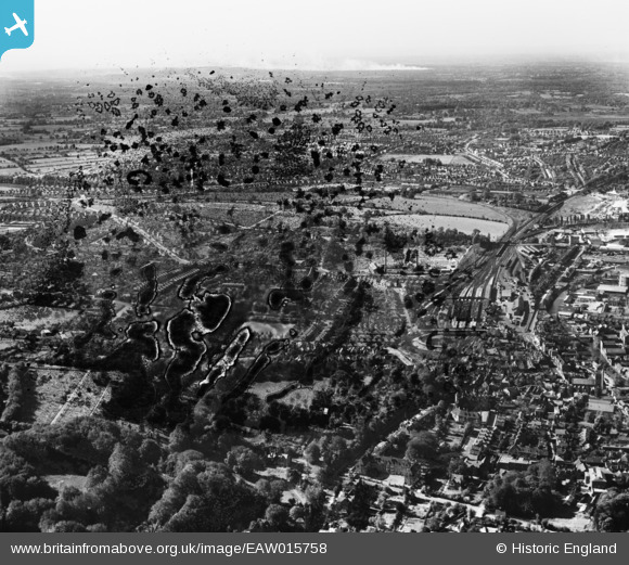EAW015758 ENGLAND (1948). The Railway Station, Stag Hill and environs, Guildford, from the south-east, 1948. This image has been produced from a damaged negative.