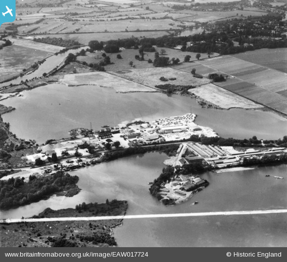| Pennawd | [EAW017724] Aggregates quarrying and processing including pre-cast concrete Works off Littleton Lane, Shepperton Green, 1948. This image has been produced from a print marked by Aerofilms Ltd for photo editing. |