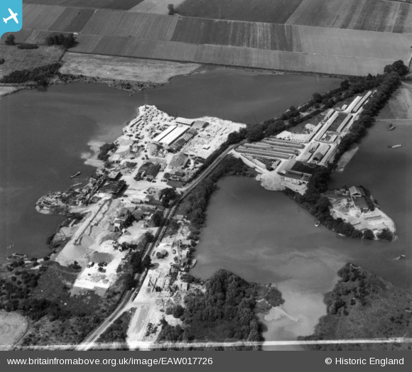 | Pennawd | [EAW017726] Aggregates quarrying and processing including pre-cast concrete Works off Littleton Lane, Shepperton Green, 1948. This image has been produced from a print marked by Aerofilms Ltd for photo editing. |