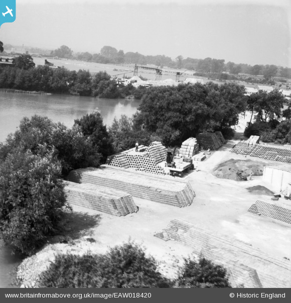 | Pennawd | [EAW018420] Concrete Pipe Works off Littleton Lane, Shepperton Green, from the east, 1948 |
