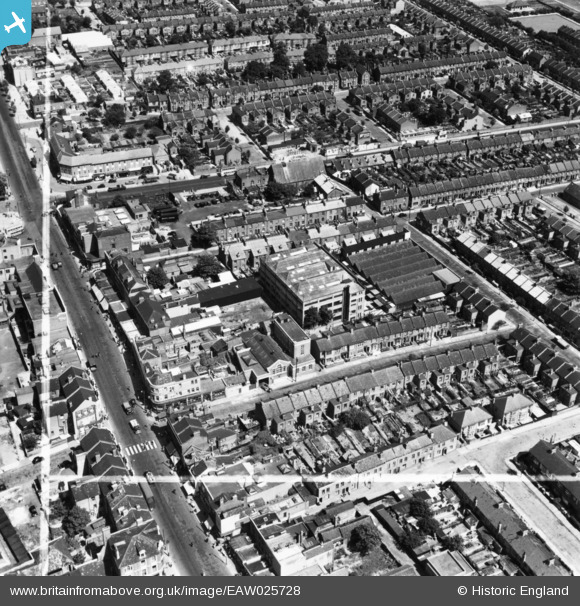 | Pennawd | [EAW025728] Upper Fore Street and the M.K. Electric Ltd Electrical Accessory Works, Upper Edmonton, 1949. This image has been produced from a print marked by Aerofilms Ltd for photo editing. |