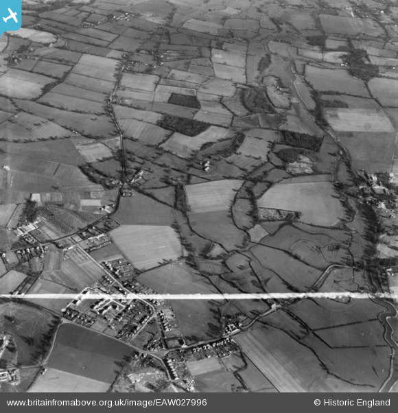 | Pennawd | [EAW027996] Shinfield Grange and surrounding countryside, Shinfield, 1950. This image has been produced from a print marked by Aerofilms Ltd for photo editing. |