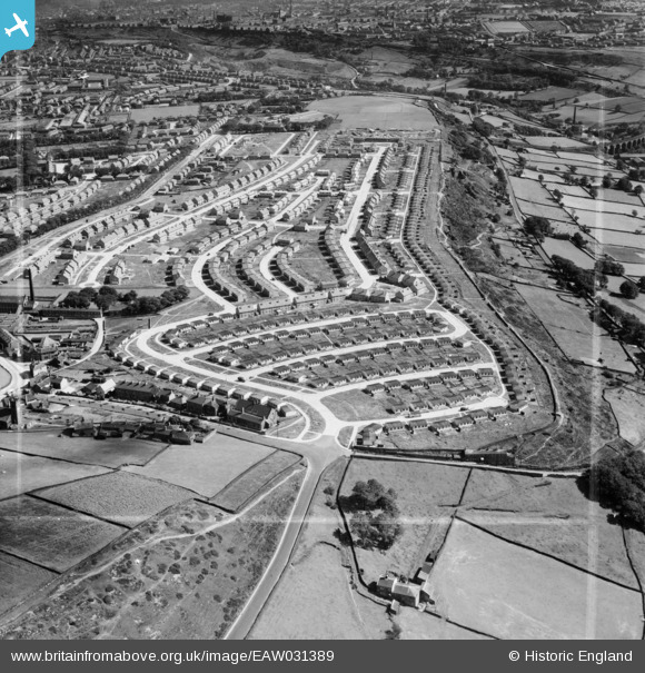 | Pennawd | [EAW031389] Housing estate at the top of Rake Bank, Ovenden, 1950. This image was marked by Aerofilms Ltd for photo editing. |