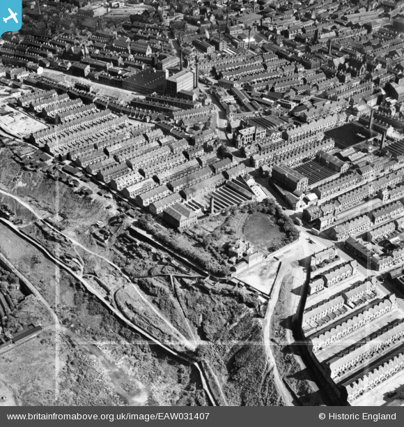 EAW031407 ENGLAND (1950). The Ajax Machine Tool Co Ltd Greenmount Works, terraced housing aroun Pellon Lane and environs, Halifax, 1950. This image was marked by Aerofilms Ltd for photo editing.