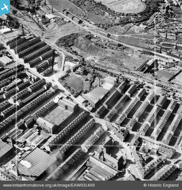 EAW031409 ENGLAND (1950). The Ajax Machine Tool Co Ltd Greenmount Works, terraced housing aroun Pellon Lane and environs, Halifax, 1950. This image was marked by Aerofilms Ltd for photo editing.
