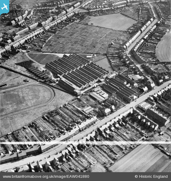 | Pennawd | [EAW041880] Clutsom and Kemps Ltd Elastic Belt and Garter Factory off Highfield Road, Coalville, 1952. This image was marked by Aerofilms Ltd for photo editing. |