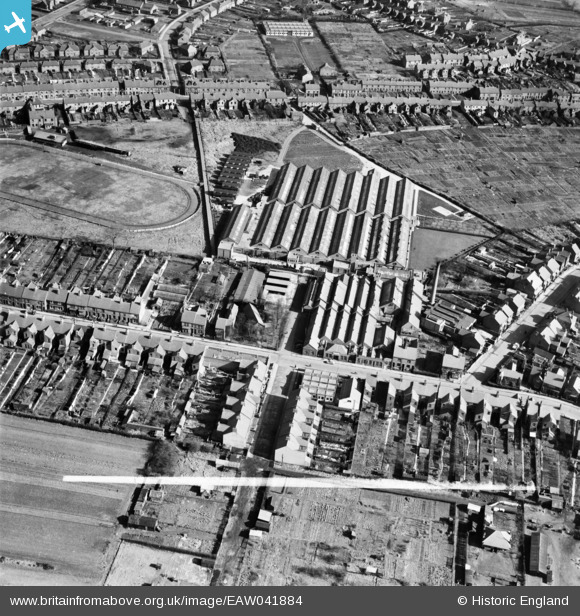 | Pennawd | [EAW041884] Clutsom and Kemps Ltd Elastic Belt and Garter Factory, Coalville, 1952. This image was marked by Aerofilms Ltd for photo editing. |