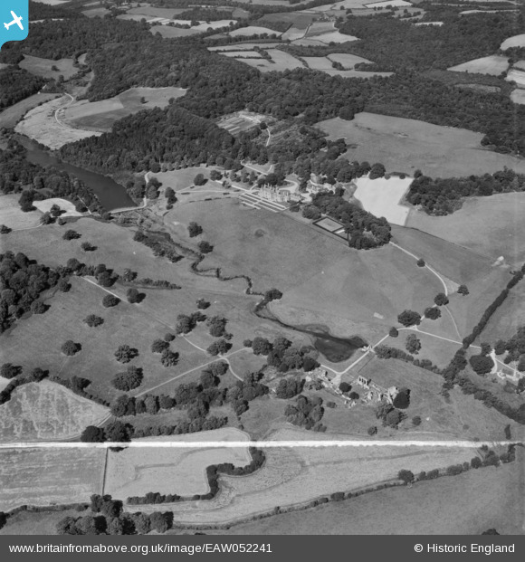 EAW052241 ENGLAND (1953). The River Teise, Bayham Abbey and surrounding parkland, Lamberhurst, 1953. This image was marked by Aerofilms Ltd for photo editing.