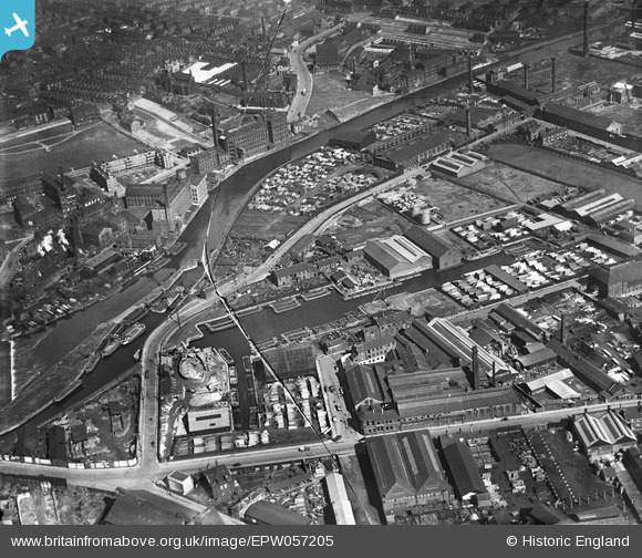 | Pennawd | [EPW057205] Clarence Dock, Fearn's Island and the surrounding industrial area, Leeds, 1938. This image has been produced from a damaged negative. |
