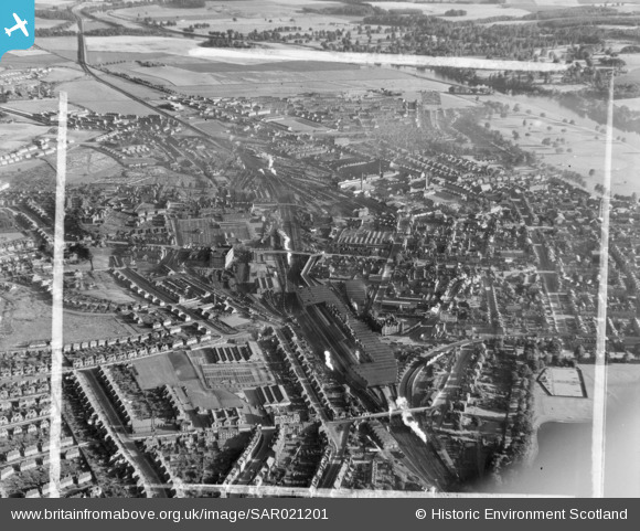 SAR021201 SCOTLAND (1954). Perth Railway Station Centre Perth, Perthshire, Scotland. An oblique aerial photograph taken facing North. This image was marked by AeroPictorial Ltd for photo editing.