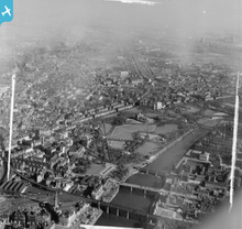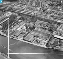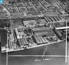 [SAW048570] Mechans Ltd. Scotstoun Ironworks, South Street and Harland and Wolff Diesel Engine Works, Balmoral Street, Glasgow. An oblique aerial photograph taken facing west. This image has been produced from a crop marked negative.
