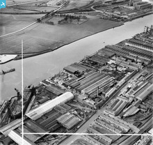 [SAW048571] Mechans Ltd. Scotstoun Ironworks and Clyde Structural Iron Co. Clydeside Ironworks, South Street, Glasgow. An oblique aerial photograph taken facing south-west. This image has been produced from a crop marked negative.