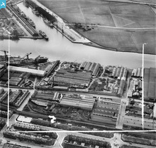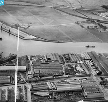 [SAW048574] Mechans Ltd. Scotstoun Ironworks and Clyde Structural Iron Co. Clydeside Ironworks, South Street, Glasgow. An oblique aerial photograph taken facing north. This image has been produced from a crop marked negative.