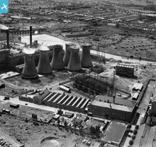 [EAW001143] The A.W. Swann & Co Ltd Hosiery Works and South Leicester Working Mens Club on Burnmoor Street and the Raw Dykes Power Station, Leicester, 1946