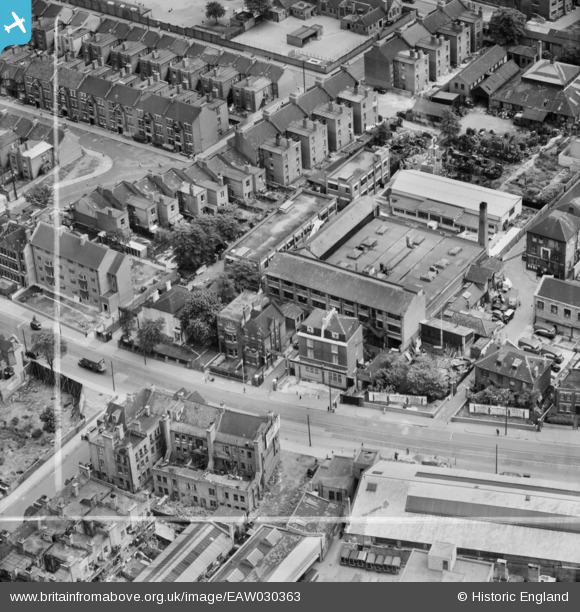 EAW030363 ENGLAND (1950). Henley & James Ltd Manufacturing Chemists on Coldharbour Lane, Brixton, 1950. This image was marked by Aerofilms Ltd for photo editing.