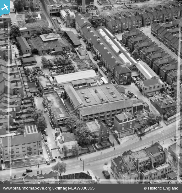 EAW030365 ENGLAND (1950). Henley & James Ltd Manufacturing Chemists on Coldharbour Lane, Brixton, 1950. This image was marked by Aerofilms Ltd for photo editing.