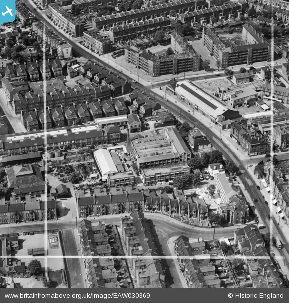EAW030369 ENGLAND (1950). Henley & James Ltd Manufacturing Chemists on Coldharbour Lane, Brixton, 1950. This image was marked by Aerofilms Ltd for photo editing.