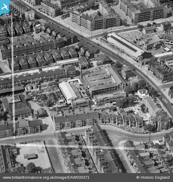 EAW030371 ENGLAND (1950). Henley & James Ltd Manufacturing Chemists on Coldharbour Lane, Brixton, 1950. This image was marked by Aerofilms Ltd for photo editing.