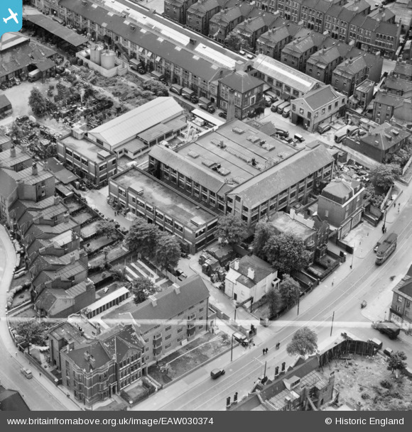 EAW030374 ENGLAND (1950). Henley & James Ltd Manufacturing Chemists on Coldharbour Lane, Brixton, 1950. This image was marked by Aerofilms Ltd for photo editing.