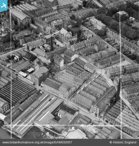EAW033057 ENGLAND (1950). Mills off Clyde Street and Whitley Street, Bingley, 1950. This image was marked by Aerofilms Ltd for photo editing.