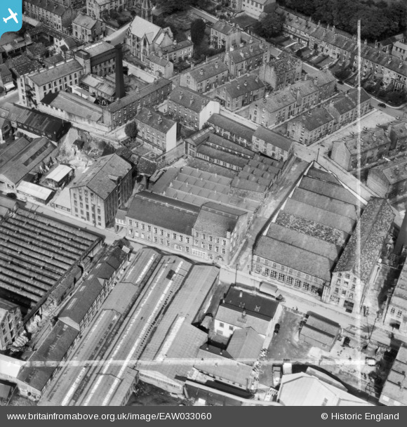 EAW033060 ENGLAND (1950). Mills off Whitley Street including the Park Road Mill, Bingley, 1950. This image was marked by Aerofilms Ltd for photo editing.