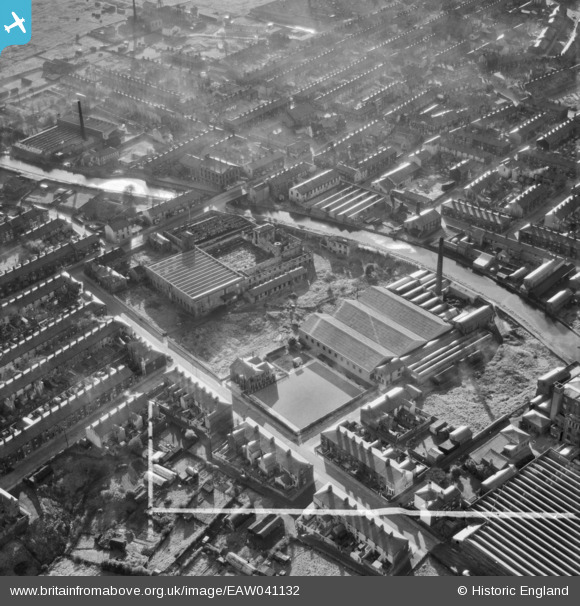 EAW041132 ENGLAND (1951). The Wheatfield Carpet Mill and the surrounding residential area, Rishton, 1951. This image was marked by Aerofilms Ltd for photo editing.
