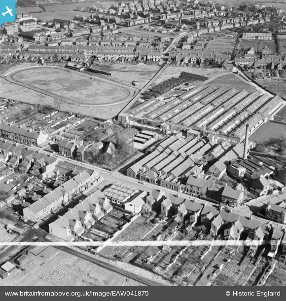 EAW041875 ENGLAND (1952). Clutsom and Kemps Ltd Elastic Belt and Garter Factory and the Coalville Greyhound Stadium, Coalville, 1952. This image was marked by Aerofilms Ltd for photo editing.