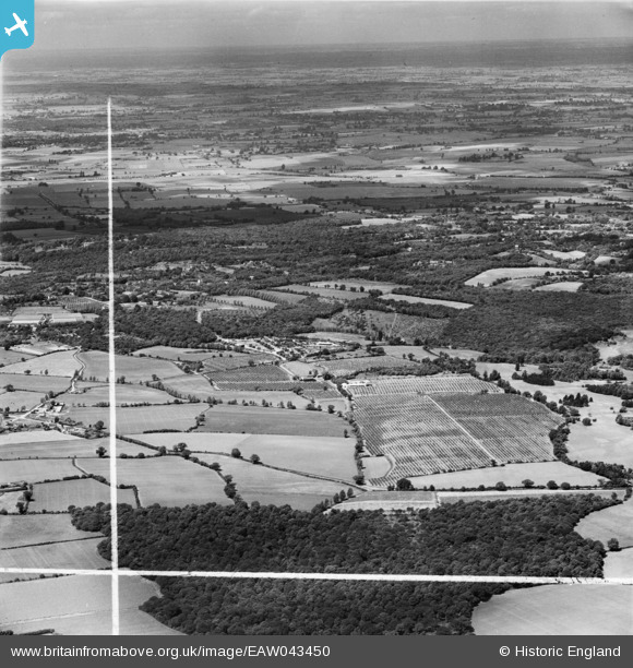 | Title | [EAW043450] Thrift Wood and Orchards at Brock's Farm, Runsell Green, from the south-east, 1952. This image was marked by Aerofilms Ltd for photo editing. |