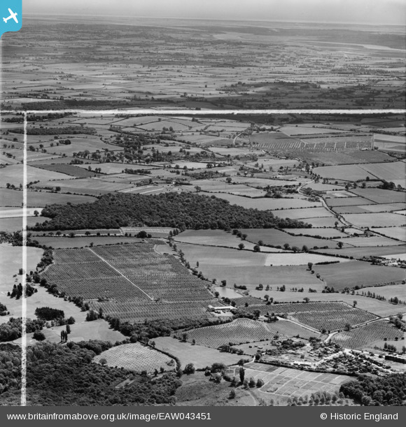 | Title | [EAW043451] Thrift Wood and Orchards at Brock's Farm, Runsell Green, from the north-west, 1952. This image was marked by Aerofilms Ltd for photo editing. |