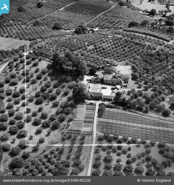 EAW045128 ENGLAND (1952). The Bickham & Haggard Ltd Hilltop Fruit Farm, Ledbury, 1952. This image was marked by Aerofilms Ltd for photo editing.
