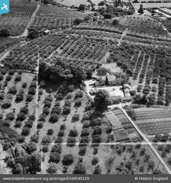 EAW045129 ENGLAND (1952). The Bickham & Haggard Ltd Hilltop Fruit Farm, Ledbury, 1952. This image was marked by Aerofilms Ltd for photo editing.