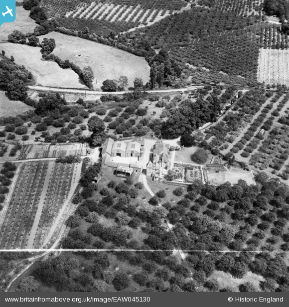 EAW045130 ENGLAND (1952). The Bickham & Haggard Ltd Hilltop Fruit Farm, Ledbury, 1952. This image was marked by Aerofilms Ltd for photo editing.