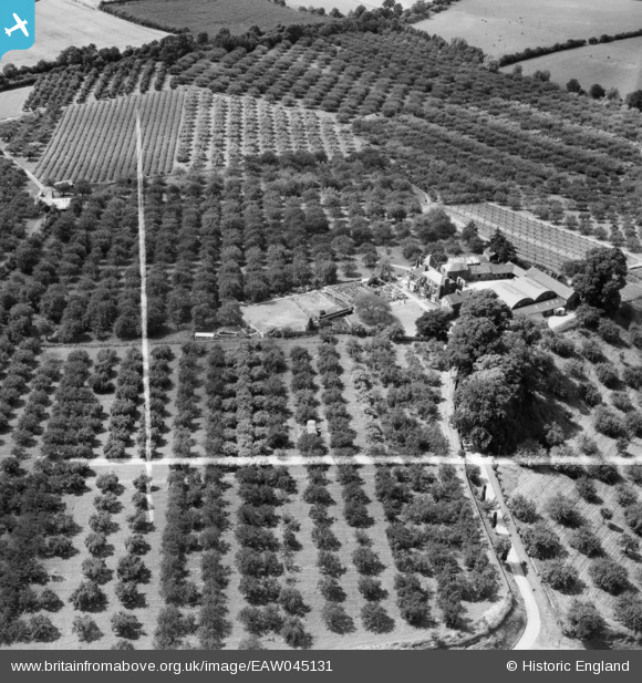 EAW045131 ENGLAND (1952). The Bickham & Haggard Ltd Hilltop Fruit Farm, Ledbury, 1952. This image was marked by Aerofilms Ltd for photo editing.