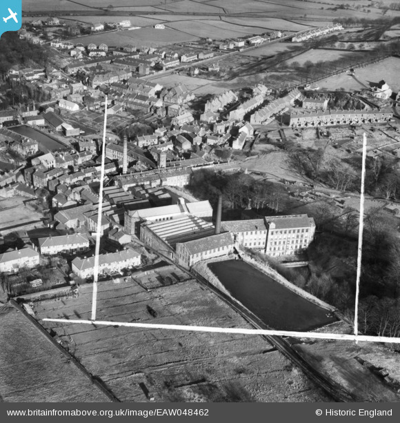 EAW048462 ENGLAND (1953). Woodlands Mill, Bobbin Mill and the village, Steeton, 1953. This image was marked by Aerofilms Ltd for photo editing.