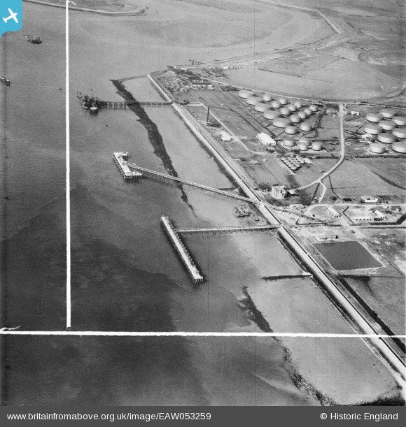 EAW053259 ENGLAND (1954). Jetties and oil depot at Hole Haven Wharf, Canvey Island, 1954. This image was marked by Aerofilms Ltd for photo editing.