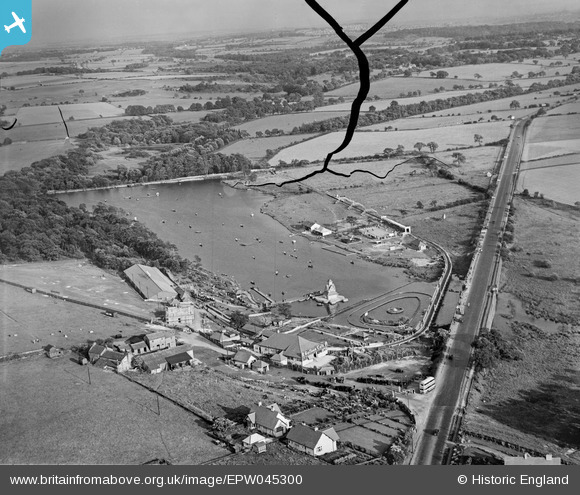 EPW045300 ENGLAND (1934). The Boating Lake and Miniature Railway, Golden Acre Park, from the north-west, 1934. This image has been produced from a damaged negative.