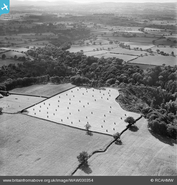 WAW030354 WALES (1950). View of haycocks in field on Ewloe castle farm