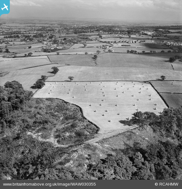 WAW030355 WALES (1950). View of haycocks in field on Ewloe castle farm
