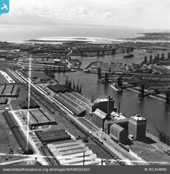 WAW036420 WALES (1951). View of Barry Docks showing Rank Hovis Atlantic Mills at No. 2 Dock. Oblique aerial photograph, 5½" cut roll film.