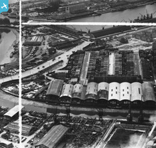 [SAW046475] John Fleming and Co. Ltd. Timber Yard, St Clement Street and Victoria Dock, Aberdeen. An oblique aerial photograph taken facing south-west. This image has been produced from a crop marked negative.