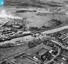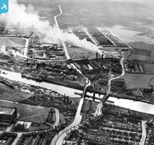 Naylors Timber Yard and the Chester Road Swing Bridge, Warrington, 19...
