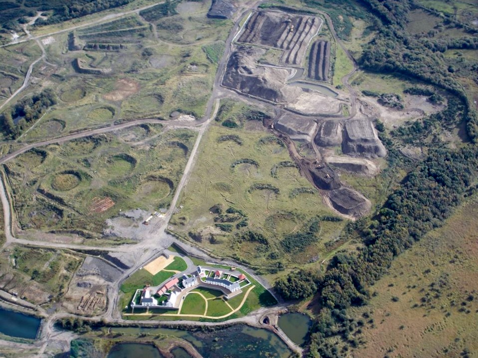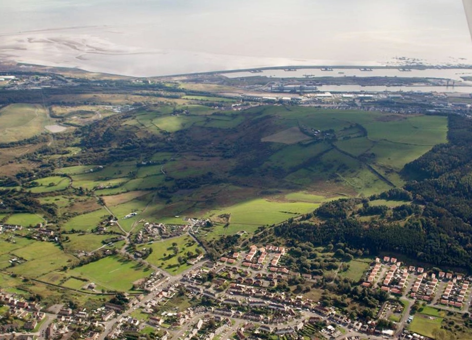 An aerial view of Llandarcy showing circular depressions where oil tanks have been removed, 9th October 2013. Courtesy Con Shields |