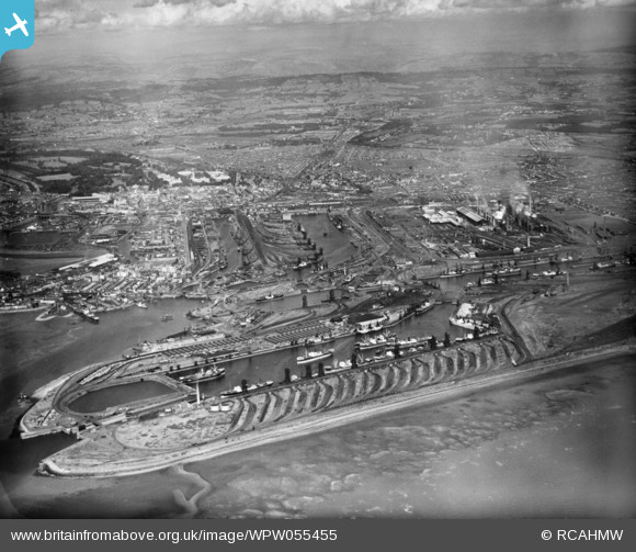 WPW055455 WALES (1937). General view of Cardiff showing docks, oblique aerial view. 5"x4" black and white glass plate negative.