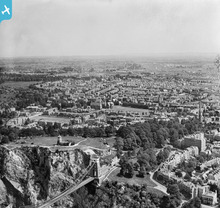The Clifton Suspension Bridge, Observatory Hill and the city, Bristol...