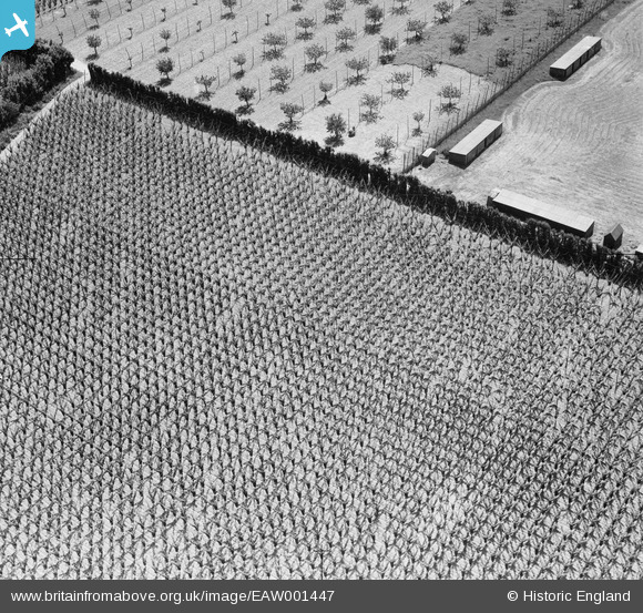 I'm pretty sure that these are the sheds in EAW001445. The detail of the sheds is spot-on, and I think the apparent difference in the field contents is just because the angle is different. Details of the orchard, such as the number of rows of trees, their individual sizes, the location of a darker patch of (turfed?) ground etc, match exactly. |