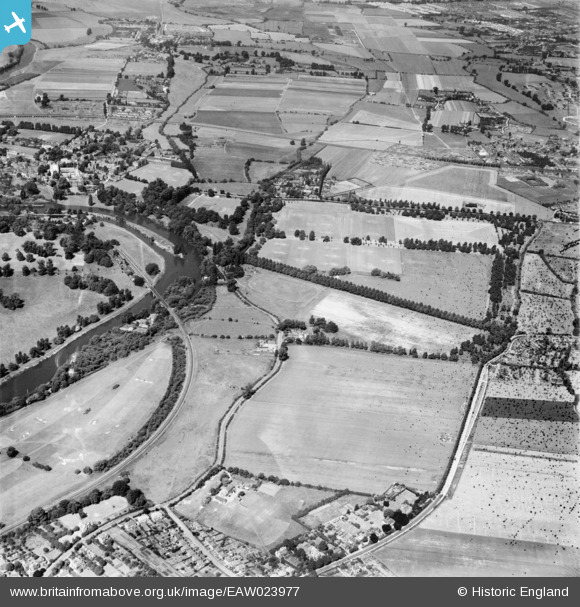Pennawd | [EAW023977] Agars Plough playing fields and environs, Eton, 1949. This image has been produced from a damaged negative. |