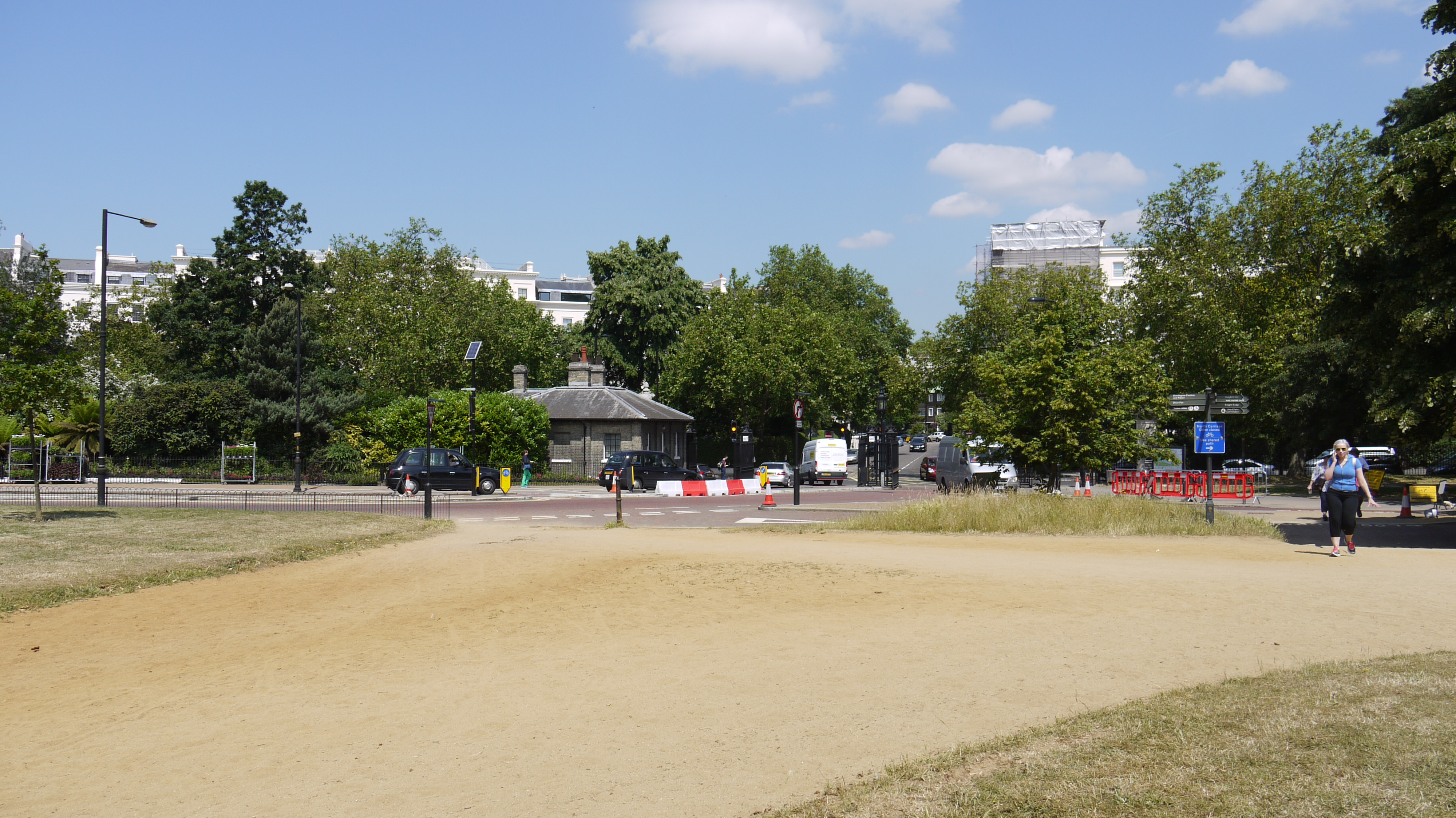 Pennawd | [EAW046372] Victoria Gate, Bayswater Road and Hyde Park Gardens, Hyde Park, 1952. This image was marked by Aerofilms Ltd for photo editing. |